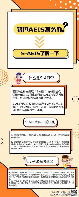 为了引近优秀人才,新加坡政府开辟AEIS考试通道(Admission Exercise for International Students),参加AEIS考试是国际学生进入新加坡政府中小学唯一途径。AEIS考试只考英语和数学,每年两次:9月下旬和2月下旬。入学时间分别是1月初和5月初。