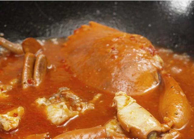 做这道菜的时候,有几点需要我们注意。一个便是调味,辣椒炒蟹再上调味的时候,桑巴酱和番茄酱是一定要加的,这样酸味、辣味、甜味会有一定的平衡;另一个就是螃蟹的选择,在新加坡当地会用斯里兰卡蟹来做,我们这里做的时候,可以用梭子蟹或者面包蟹来替代;第一次炸蟹的时候,不能用大火,因为这样会使蟹肉干柴;最后加入蛋液的时候,几秒钟就可以关火了。