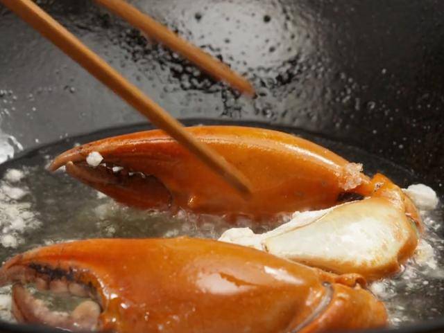 取一口炒锅,倒油加热,然后将蟹件放入锅中,用中火将蟹件炸至上色,便可以捞出了,放于盘中备用。