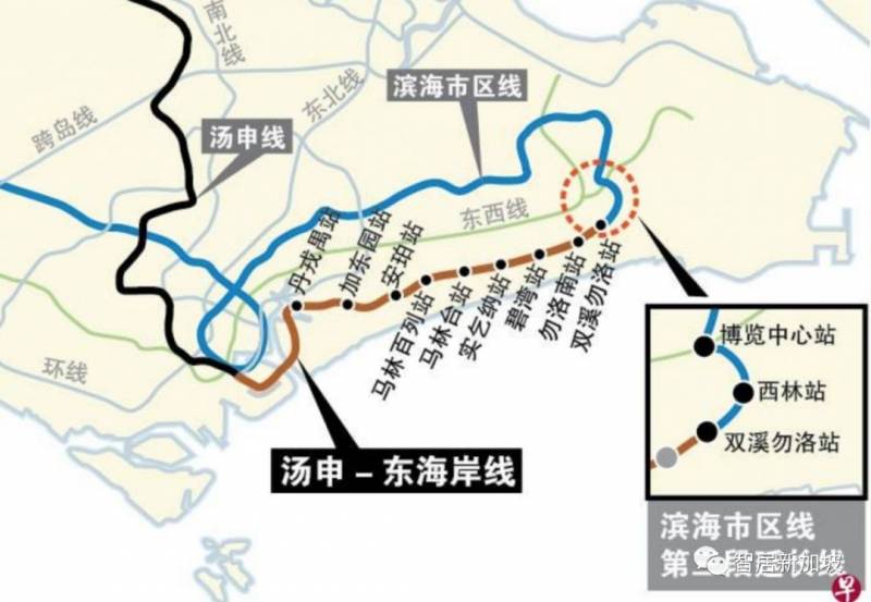 汤申-东海岸线上九个站的位置分别为:丹戎禺、加东园、安珀、马林百列、马林台、实乞纳、碧湾、勿洛南和双溪勿洛。