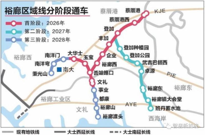 新地铁线将分三个阶段通车。率先开通的是西侧路线,连接蔡厝港到文礼和大华士;第二阶段是衔接登加和班丹蓄水池的接驳线,最后通车的延长线,将延伸到南洋理工大学校园和裕廊渡头。