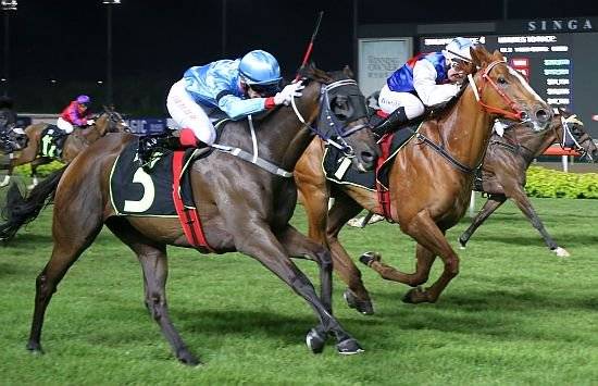 “小大人”(外侧3号)的骑师抗议成功,在裁判室内夺得冠军。(新加坡赛马公会网站照片)