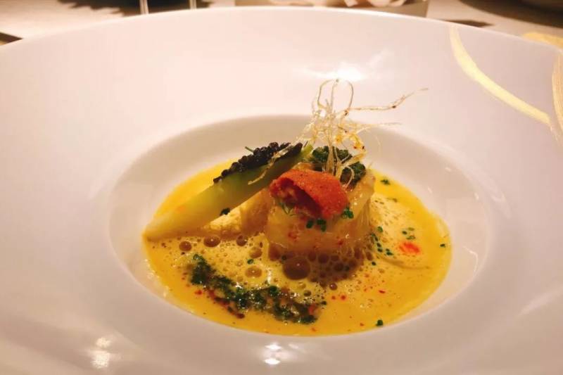 北海道的带子是主角,下面的金桔龙虾酱反倒让人惊艳,尝一口,鲜美的没边儿了。一段青葱和海胆,完成了搭配,这一道,味道印象深刻。