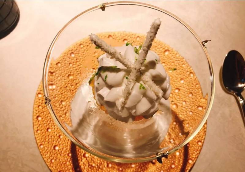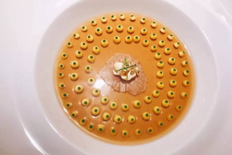那一粒粒黄色,用玉米打成酱,上面每一滴绿色,九层塔打成泥,搭配鹅肝酱,味道层次丰富,口感细腻,堪称视觉飨宴。