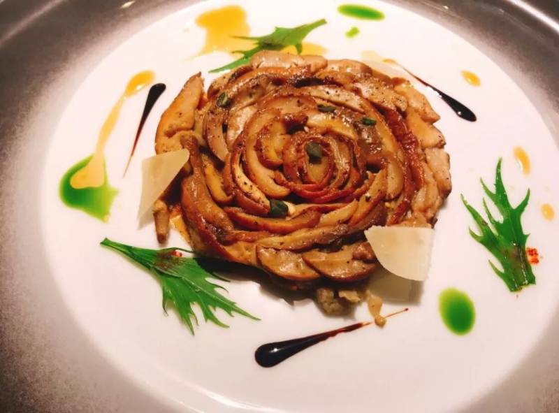 令人叹为观止的玫瑰花设计,牛肝菌和茄子煎了切成细片,上面添加阿尔巴白松露,每一口都香浓。