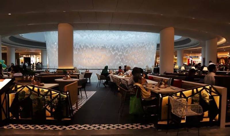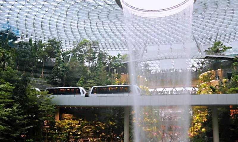 最引人瞩目的,就是室内瀑布的雨旋涡, 40米高的雨旋涡位于星耀樟宜正中央位置。