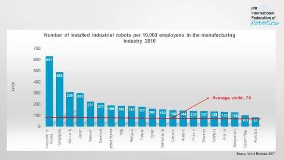 2016年,在全球制造业每1万名员工中,平均对应74台(2015年为66个)机器人,而韩国这个数据是631台,远超第二新加坡的488和第三德国的309。
