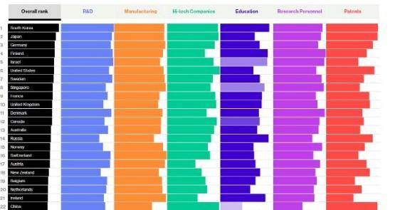 韩国政府将高科技创新提升到国家战略的高度。韩国一直在彭博编制的全球国家创新力指数排名中名列前茅,尤其是GDP中用于研发、教育的比重一直排在全球第一。