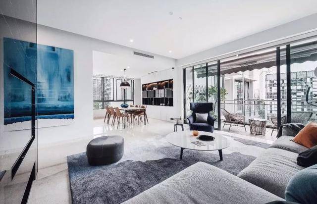 空间整体的中性浅色调,亦营造出最干净温和的视觉观感,同时辅之较大面积的靛蓝色块与之搭配,用冷调降低新加坡四季炎夏的灼热感。