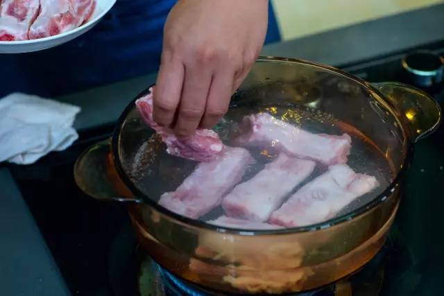 将猪肋排放入滚水中汆烫,汆至没有血水捞出备用。