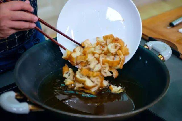 用筷子试油温,稍微有温度即可炸油条,油条炸至酥脆捞出备用,因为出锅后炸过的油条还会继续导热。
