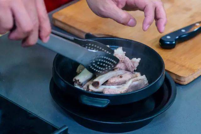 将汆好的猪肋排用凉水冲洗干净,可去除腥味。