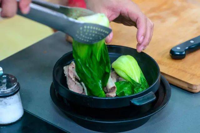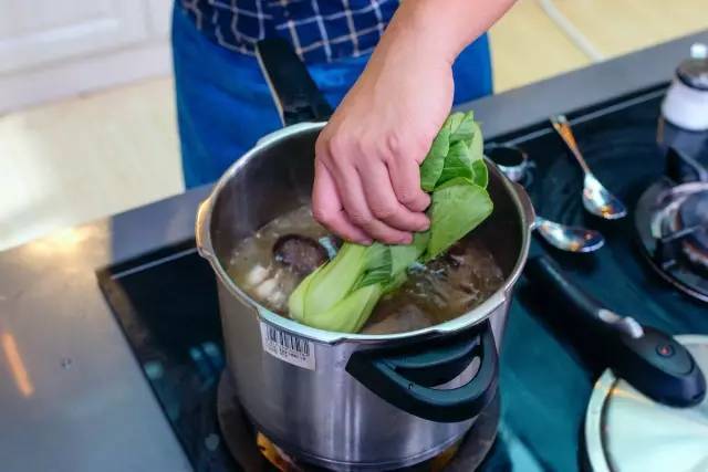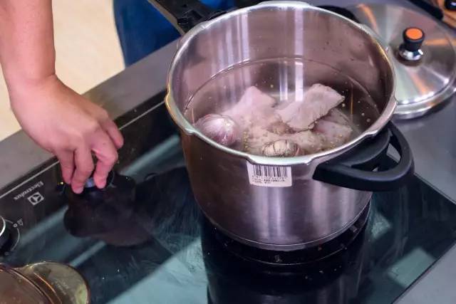 将两大匙白胡椒粒、带皮的整颗大蒜、花菇放入高压锅焖煮30分钟。