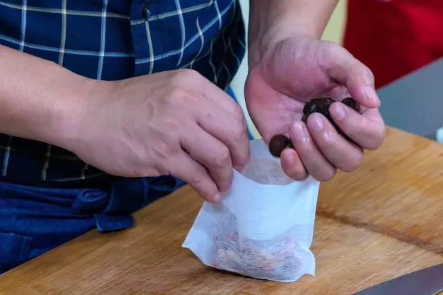 将八角2颗、甘草8片、陈皮少量、枸杞一大匙、桂圆干10颗放入卤包中。