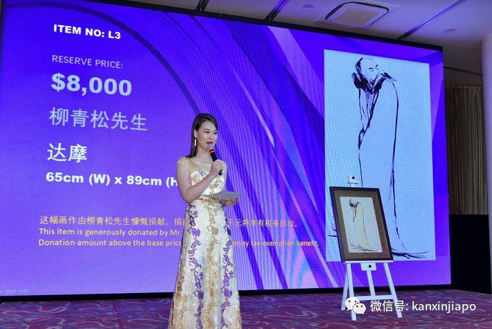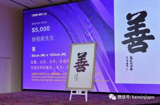 钱丹丹慷慨捐献的慧常居士书法作品《善》由叶成德以1万2000新币标得,他再次捐出来投标由赵先生以8000新币标得,此幅作品筹得2万新币。