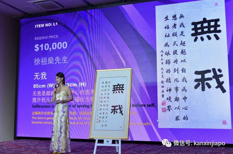 本地著名书法家94岁高龄徐祖燊捐献的书法作品《无我》由拿督斯里范仁瑞以1万6800新币标得。