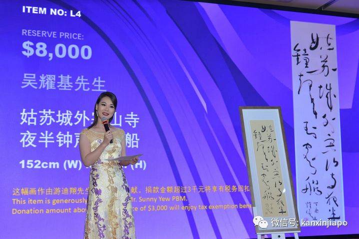 游迪翔慷慨捐献的、吴耀基的作品《姑苏城外寒山寺 夜半钟声到客船》由魏成雄以8000新币标得。拍卖环节共筹得5万3688新币。