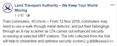 在新加坡乘坐地铁的朋友们注意!下周一(11月12日)后,你要开始接受安检了~