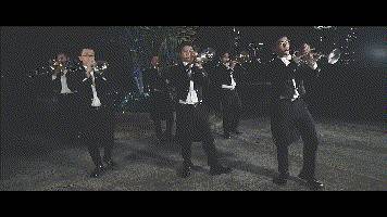 随后乐队上场吹响小号,还踏着整齐划一的步调随节奏舞动。