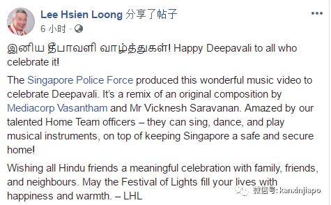 (排灯节快乐! 祝所有庆祝它的人节日快乐!新加坡警察部队制作了这个精彩的音乐视频来庆祝屠妖节。我为我们的警员们的才华感到震惊,他们可以唱歌, 跳舞, 玩乐器, 最重要的是他们让新加坡成为一个安全的家!祝所有印度教朋友能与家人, 朋友和邻居度过一个有意义的节日。愿排灯节充满幸福和温暖。)