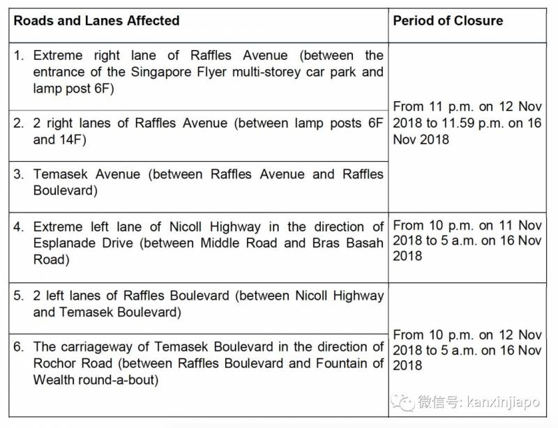 受影响的道路包括尼浩大道、莱佛士林荫道、淡马锡林荫道等,这些道路的部分路段或车道,将从本周日(11月11日)开始关闭,一直到下周五(11月16日)。
