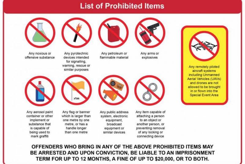 有害或有攻击性物品、易燃材料、爆炸性物质、喷漆罐、大于1m x 1m的大型旗帜、扩音器、广播设备、手铐。