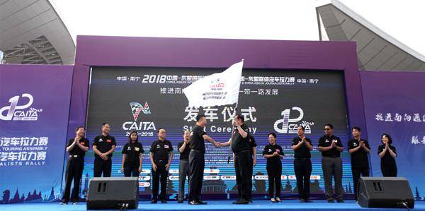 裁判员代表及车手代表分别在仪式上宣誓,表示将严格遵守竞赛规则纪律,严肃认真,圆满完成落实自身任务。随后,广西壮族自治区人民政府副主席黄俊华正式为本次拉力赛国外赛段指挥长谢强授旗,寄予赛事境外段圆满成功。发车指令响起,所有参赛车辆从广西体育中心出发,就此拉开了“推进国际陆海贸易新通道,服务一带一路发展”2018中国—东盟国际汽车拉力赛暨中国—东盟媒体汽车拉力赛境外赛段的序幕。