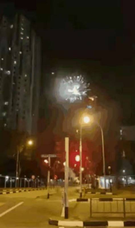 武吉巴督组屋区,有人在组屋楼下草丛燃放烟花,火花喷射高达十层楼,射中组屋的外墙,