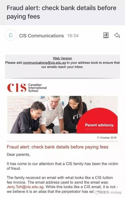 前段时间有家长反映:有诈骗人员冒充新加坡加拿大国际学校(CIS)的工作人员发送邮件给家长,内容是学费发票之类的事由,要求家长将钱款打入指定的账号......