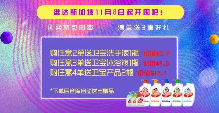 3.任意2单,送卫宝215ML洗手液1瓶;任意3单,送卫宝1000ML沐浴液1瓶;任意4单或以上,送卫宝沐浴、洗手液各1瓶。