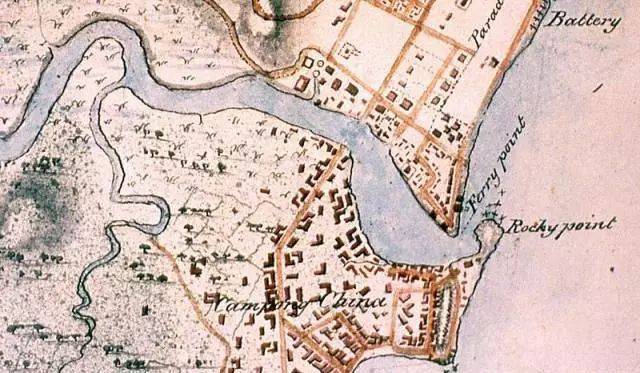 地图中新加坡河入海口处南岸的那一个标为“Rocky Point”近乎90度的拐角,就是后来的新加坡邮政总署,如今的富尔顿大酒店(The Fullerton Hotel);那个Ferry Point,就是现在的维多利亚剧场前面广场的新加坡抗日英雄林谋盛纪念碑;而地图上标注的Kampong China(马来语,字面意思是China Village),就是今天的Chinatown牛车水。至于说如今的鱼尾狮雕像和滨海艺术中心(Esplanade),呵呵,当年还是汪洋一片呢。