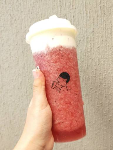 芝芝莓果采用的是鲜榨的草莓混合蓝莓组合,搭配绿妍茶底。水果茶上也有一层芝士奶盖,有点咸咸的芝士加上甜甜冰冰的水果茶,喝起来十分有层次感。