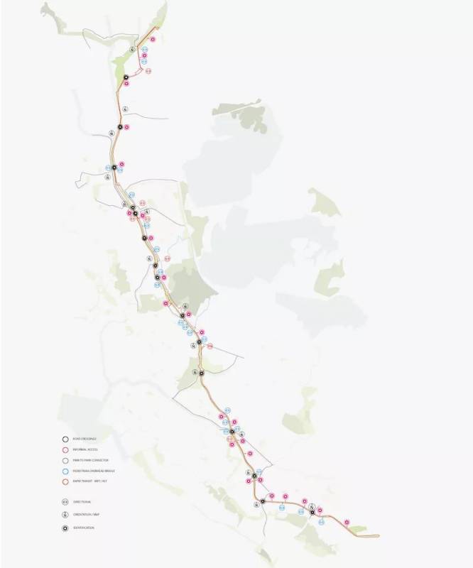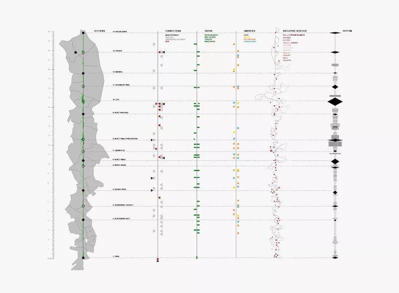新加坡铁路走廊是一条历史悠久的铁路路线,将新加坡国家一分为二。曾经由马来西亚拥有并于2011年回归新加坡,24公里长的废弃走廊代表着一个国家规模的步行之旅。虽然它可以一次遍历,但人们更有可能步行游览部分旅程,在沿着长度的特定街区的不同点处进出走廊。走廊穿过该国的许多地区,从南部的密集大都市,到住宅郊区的地块,再到北部的丛林腹地。Space agency受邀为其进行导视系统设计。