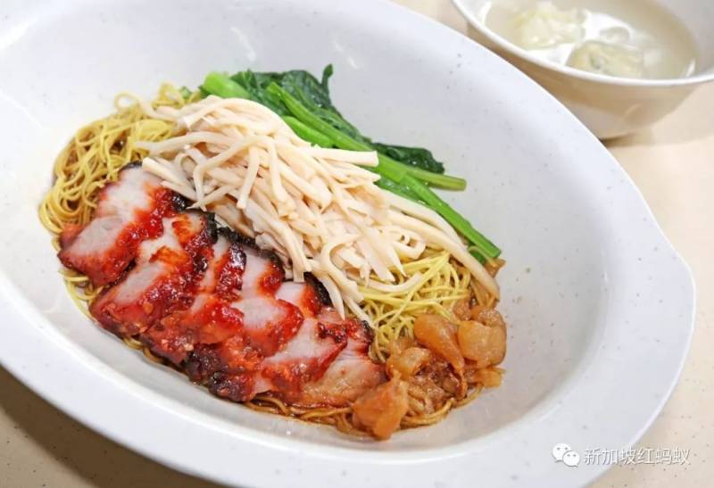 叉烧是“不见天”叉烧。这是特指猪前蹄腋下的肉,据说肉质嫩滑多汁,烧烤成叉烧就成了叉烧极品。但是哦,中峇鲁巴刹著名的“忠于原味云吞面”,就是以“不见天叉烧”多年来远近驰名的,他一份云吞面只卖$4。