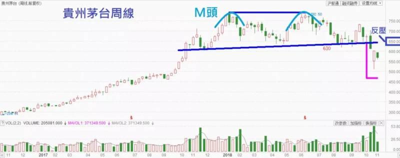 贵州茅台周线跌破颈线, 约一年的大M头确立, 技术面650元附近颈线反压站不回先看第一波跌幅满足, 请按照我的公式自行计算, 就酱, 简单易懂, 不用搞得太复杂, 等吧, 操作就是要简单化。