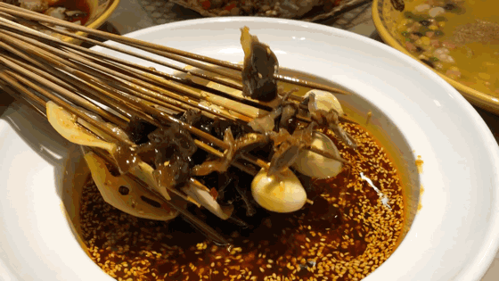汤底是由20多种香料和大骨汤熬制而成,鲜美到就连汤底都想全部喝光。土豆、藕片、黑木耳、鸡胗吸收了大量的汤汁后,浓烈的红油顺着竹签慢慢滴落,每一根签签都新鲜入味。神奇的是,红油一点都不油腻,反而让人胃口大开。