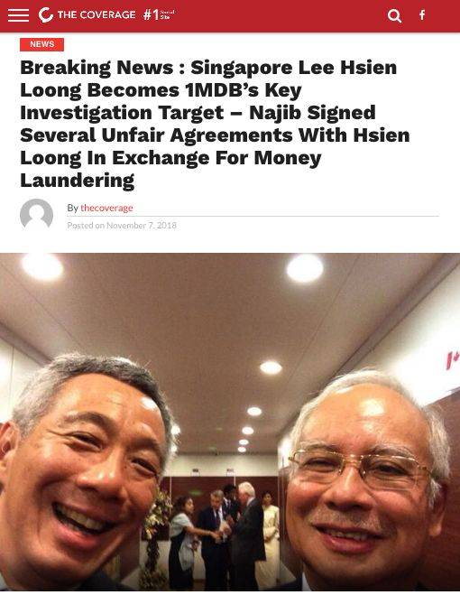近日,马来西亚社交新闻网站《The Coverage》出现了一篇报道,名为《突发新闻:新加坡总理李显龙成1MDB头号调查对象 - 纳吉与李显龙签下几项不平等的协议来换取洗钱》。