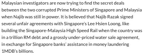 文章里还写道:“马来西亚调查人员目前正在试图找出前首相纳吉还在位时,与新加坡总理之间的秘密交易。一般相信,纳吉与新加坡总理李显龙签署了几项不公平的协议,比如在马来西亚正陷入万亿令吉债务的时候提出要建设新马高铁,以及价格过于便宜的供水协议,以此来换取新加坡银行帮助洗白1MDB的数十亿资金。”