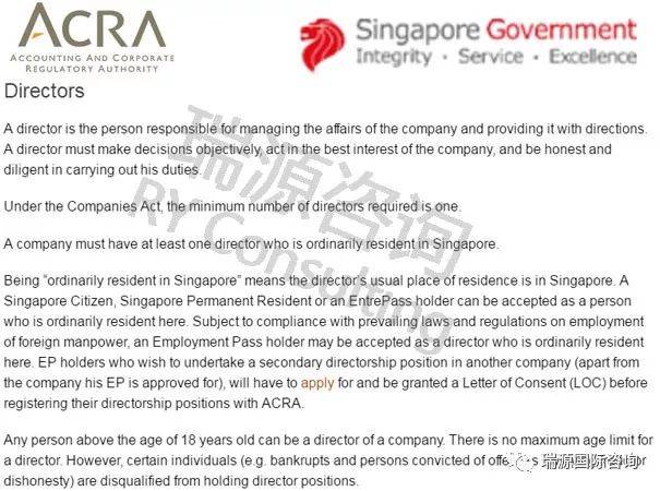 注意:如果工作准证持有人,想要担任第二家新加坡公司的董事(申请工作准证公司之外),需要单独向新加坡政府申请“同意书”,才能向新加坡注册局登记。