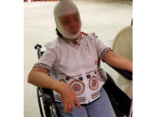 一名女伤者头部包扎坐在轮椅上。(Stomp)
