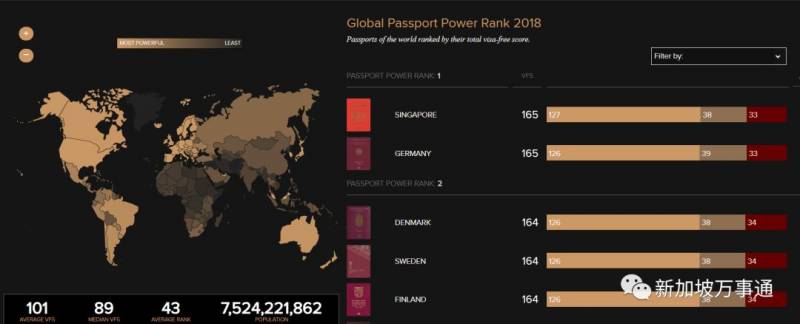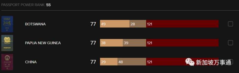 新加坡护照可以免签165个国家。截止到2018年10月29日, 中国护照免签的国家或地区数量为77个。