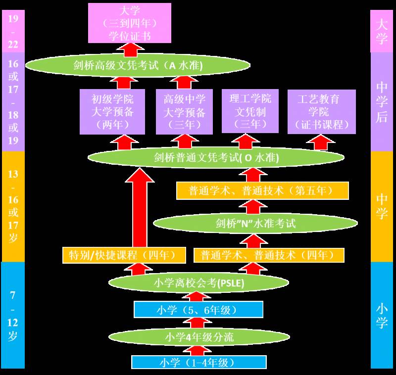 step 1 小四分流考试:新加坡小四学生在进入五年级前进行第一次分流考试。双语成绩配合数学、道德教育成绩,将学生分为EM1、EM2、EM3(EM1的学生成绩最好,以此类推)三类。 step 2 小六会考:小学第二次分流就是小学毕业的离校考试,普通双语班好延长双语班通过PSLE考试之后,进入中学,根据成绩入读三种不同的课程班:特选课程班、快捷课程班、普通课程班。 step 3 中二分流:中三开始,新加坡学生开始分科(类似于国内高二分文理科),有三条路径:理科、人文、艺术。考初级学院需要六科成绩、考理工学院需要五科成绩。 step 4 O水准考试:剑桥O水准考试(O Level)是英联邦国家标准的初中升高中考试。 step 5 A水准考试:剑桥A水准考试(A Level)是英联邦国家标准的大学入学考试。凭此A水准考试,学生可以申请新加坡政府大学,以及英国,澳洲的大学。