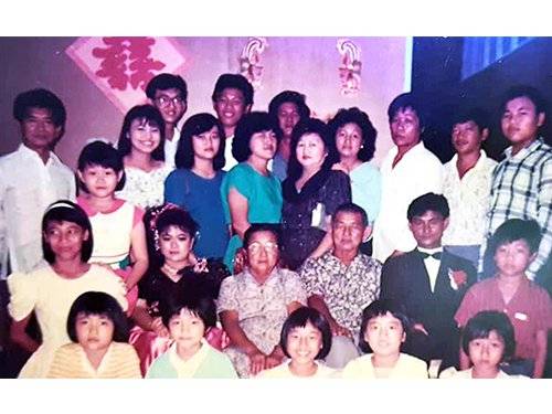 林亚妹(青色者)出示一张弟弟结婚时拍下的全家福,中间坐着母亲沈赛珠(二排左3)和父亲林金荣(二排左4)。(受访者提供)