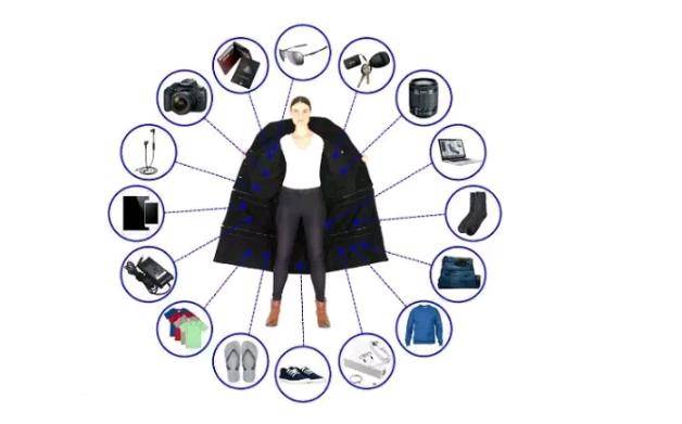 “超级行李外套”外套有十四个深口袋和一个可随身携带的行李袋。当衣服全部放下来时,可以放进两台笔记本电脑、一台iPad、两双鞋、两条牛仔裤、5件T恤、1件套衫和1部相机。