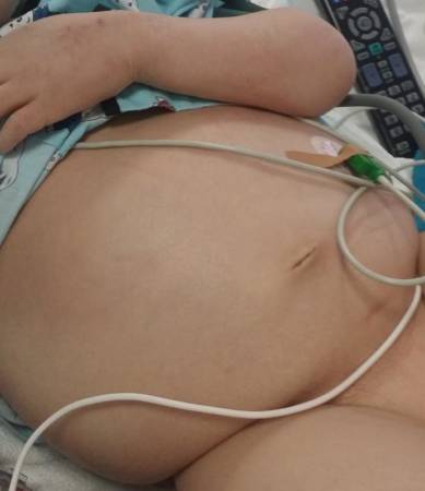 洪镁慧的儿子在大约6岁时,因为肾脏出了问题,导致肚子非常肿胀,犹如孕妇一般。(受访者提供)