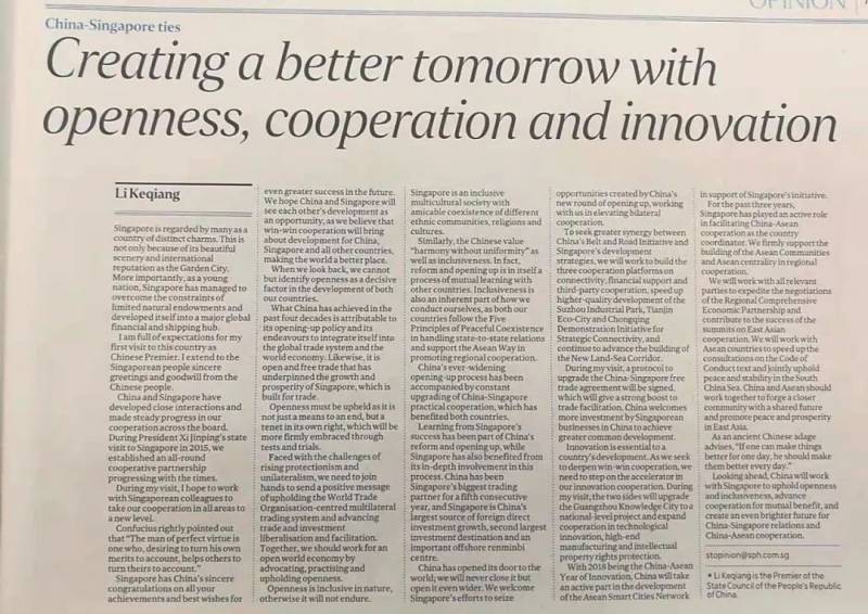 2018年11月12日,新加坡《联合早报》刊发李克强总理署名文章《开放合作,创新发展,明天会更好》,全文如下: