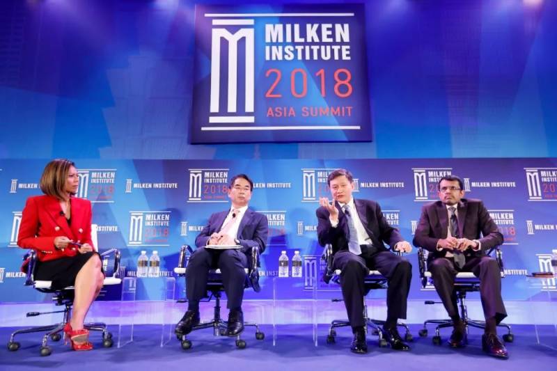 今年9月,唐宁(右二)曾与新加坡金融管理局局长Ravi Menon(右一)在“Milken Institute 2018亚洲峰会”的开幕论坛进行对话。