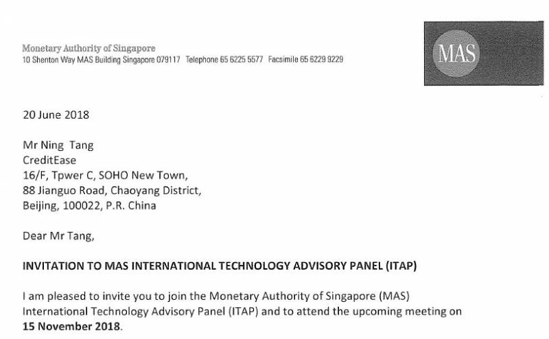 这回去新加坡,唐宁会参加第三届新加坡金融科技节,此外还有一项极为重要的工作,那就是要在11月15日,唐宁被新加坡政府邀请,以新加坡政府金融科技国际咨询顾问身份,参加新加坡金融管理局国际技术咨询委员会(ITAP)会议。值得一提的是,这是一个闭门的政府咨询会议。