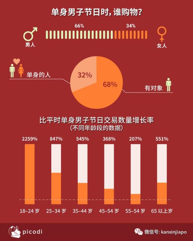年轻新加坡人对单身男子节日特别感兴趣。如果比平时做对比,11月11日18-24年龄段购物数量增长2200%。其他年龄段购物数量也大大增长。