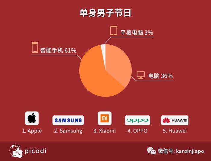 大多数买家,即超过60%,去年单身男子节日用移动设备进行购买。用电脑购买的买家少于40%。 在移动设备的用户中,最常买物品的人是Apple品牌设备的所有者,三星第二,然后是小米,OPPO和华为。